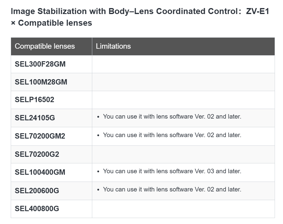 The list of supported lenses with OSS enabled is available on the [Sony website](https://support.d-imaging.sony.co.jp/www/cscs/function/compatibility.php?fnc=1002\&area=gb\&lang=en\&ref=1). If the link ever stops working, here's the current list as of Oct 2025: